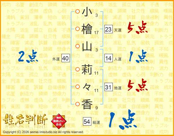 小(3画)檜(17画)山(3画) 莉(11画)々(11画)香(9画)