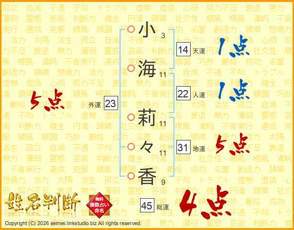 小(3画)海(11画) 莉(11画)々(11画)香(9画)
