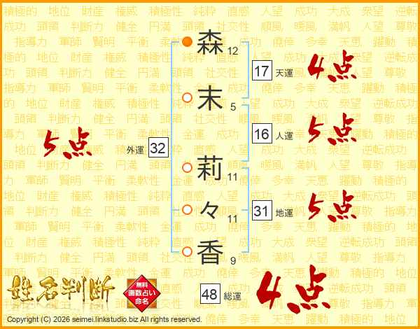 森(12画)末(5画) 莉(11画)々(11画)香(9画)