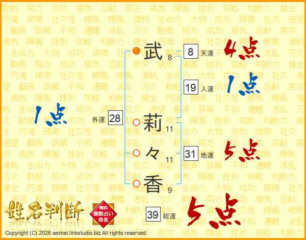 武(8画) 莉(11画)々(11画)香(9画)