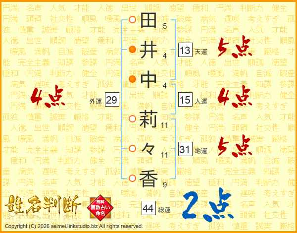 田(5画)井(4画)中(4画) 莉(11画)々(11画)香(9画)