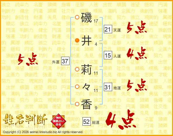 磯(17画)井(4画) 莉(11画)々(11画)香(9画)