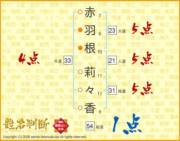 赤(7画)羽(6画)根(10画) 莉(11画)々(11画)香(9画)