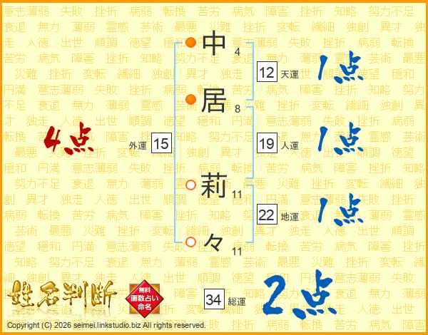 中(4画)居(8画) 莉(11画)々(11画)