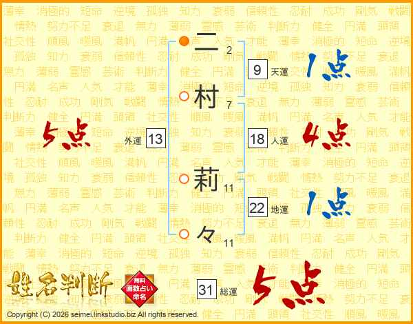 生活面を象徴する運勢です。外部から受ける影響力を表し、結婚運、家庭運や職場、環境への順応性を表します。総運から人運を引いた画数。姓や名が1文字の場合を除く。