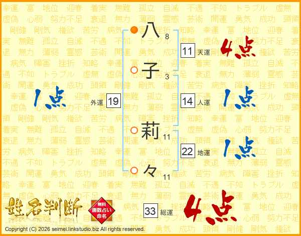 生活面を象徴する運勢です。外部から受ける影響力を表し、結婚運、家庭運や職場、環境への順応性を表します。総運から人運を引いた画数。姓や名が1文字の場合を除く。