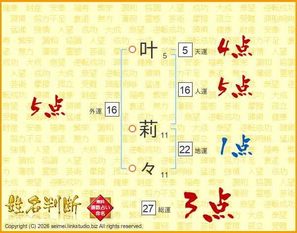 叶(5画) 莉(11画)々(11画)