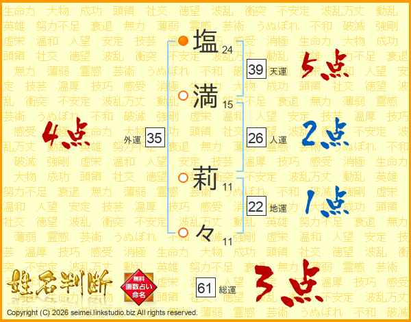 塩(24画)満(15画) 莉(11画)々(11画)