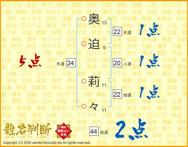 奥(13画)迫(9画) 莉(11画)々(11画)