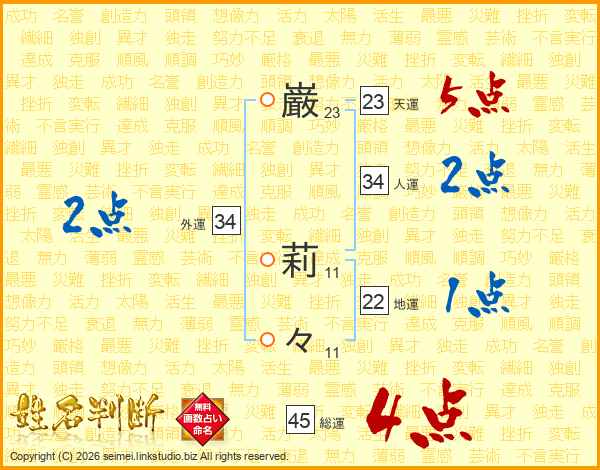 生活面を象徴する運勢です。外部から受ける影響力を表し、結婚運、家庭運や職場、環境への順応性を表します。総運から人運を引いた画数。姓や名が1文字の場合を除く。
