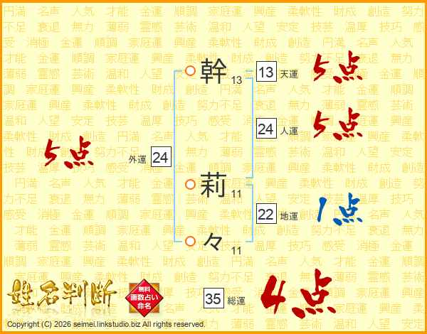 幹莉々さんの総運は35画の4点!