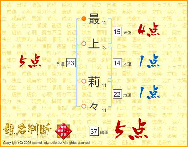 最上莉々さんの総運は37画の5点!