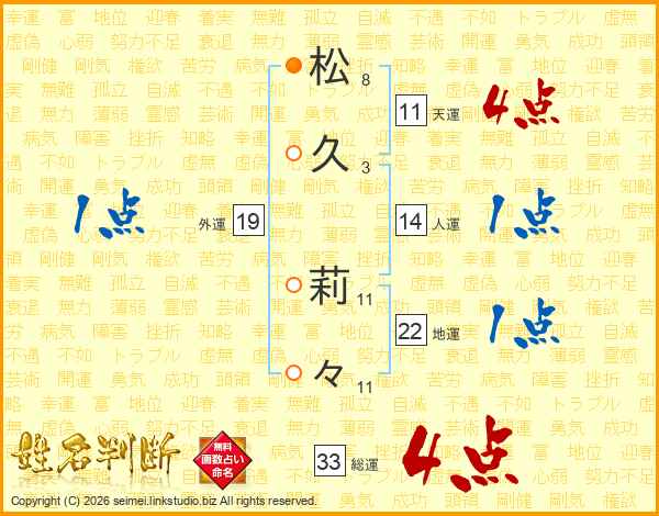 生活面を象徴する運勢です。外部から受ける影響力を表し、結婚運、家庭運や職場、環境への順応性を表します。総運から人運を引いた画数。姓や名が1文字の場合を除く。