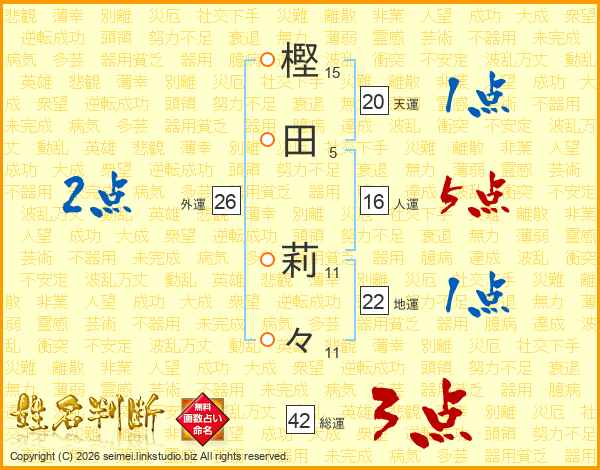 生活面を象徴する運勢です。外部から受ける影響力を表し、結婚運、家庭運や職場、環境への順応性を表します。総運から人運を引いた画数。姓や名が1文字の場合を除く。