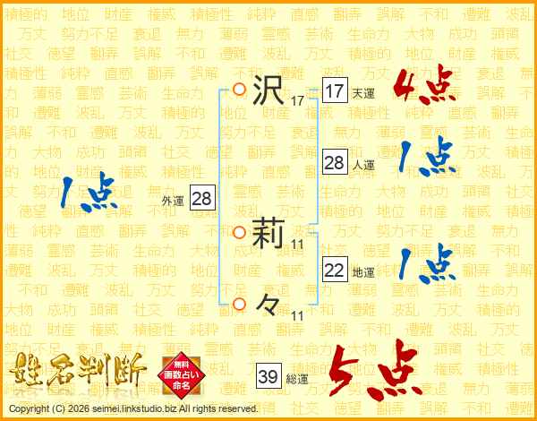沢莉々さんの総運は39画の5点!