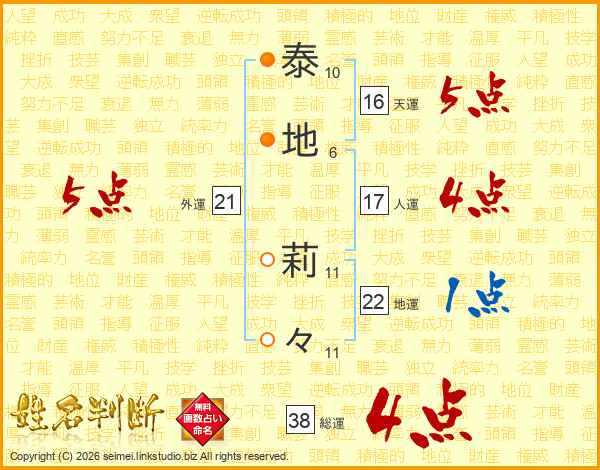 生活面を象徴する運勢です。外部から受ける影響力を表し、結婚運、家庭運や職場、環境への順応性を表します。総運から人運を引いた画数。姓や名が1文字の場合を除く。
