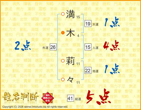 満(15画)木(4画) 莉(11画)々(11画)