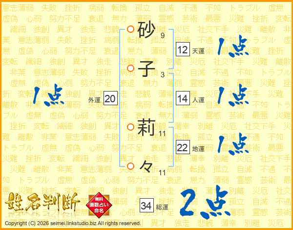 砂子莉々さんの総運は34画の2点!