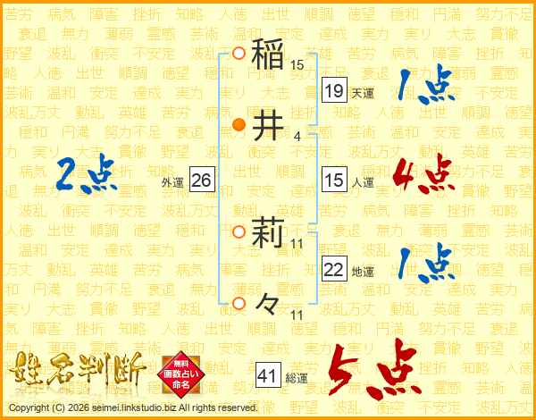 生活面を象徴する運勢です。外部から受ける影響力を表し、結婚運、家庭運や職場、環境への順応性を表します。総運から人運を引いた画数。姓や名が1文字の場合を除く。