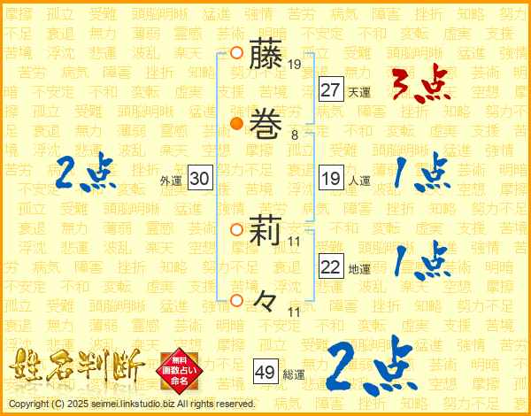 藤(19画)巻(8画) 莉(11画)々(11画)