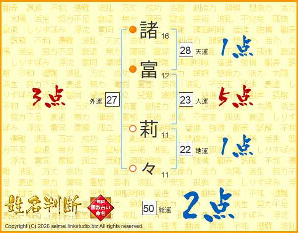 生活面を象徴する運勢です。外部から受ける影響力を表し、結婚運、家庭運や職場、環境への順応性を表します。総運から人運を引いた画数。姓や名が1文字の場合を除く。