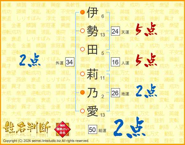 伊(6画)勢(13画)田(5画) 莉(11画)乃(2画)愛(13画)