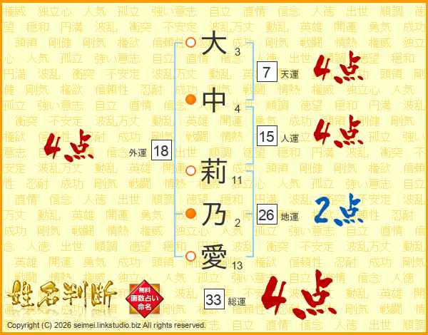 大(3画)中(4画) 莉(11画)乃(2画)愛(13画)
