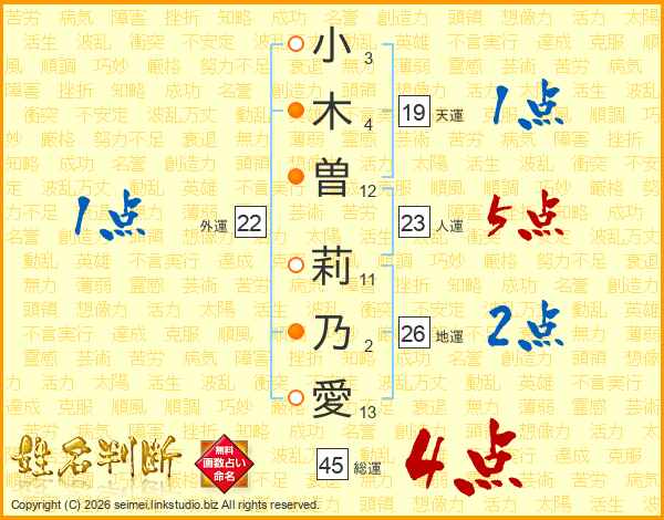 小(3画)木(4画)曽(12画) 莉(11画)乃(2画)愛(13画)