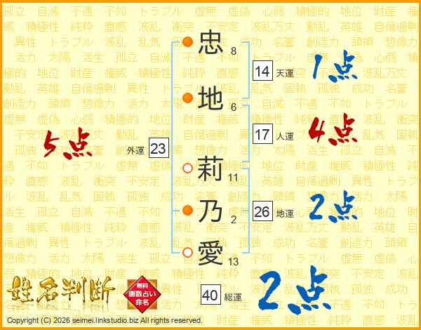 忠(8画)地(6画) 莉(11画)乃(2画)愛(13画)