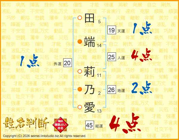 田(5画)端(14画) 莉(11画)乃(2画)愛(13画)