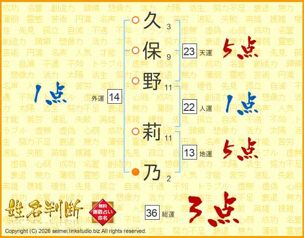 久(3画)保(9画)野(11画) 莉(11画)乃(2画)