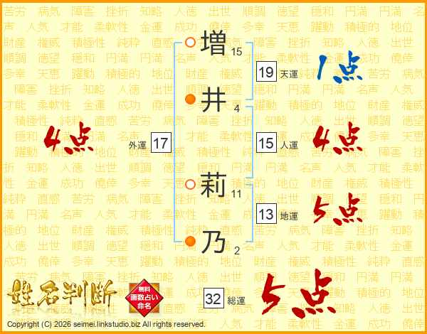 増(15画)井(4画) 莉(11画)乃(2画)