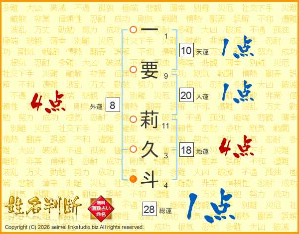 一(1画)要(9画) 莉(11画)久(3画)斗(4画)