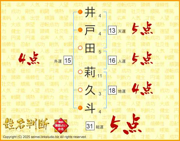 井(4画)戸(4画)田(5画) 莉(11画)久(3画)斗(4画)
