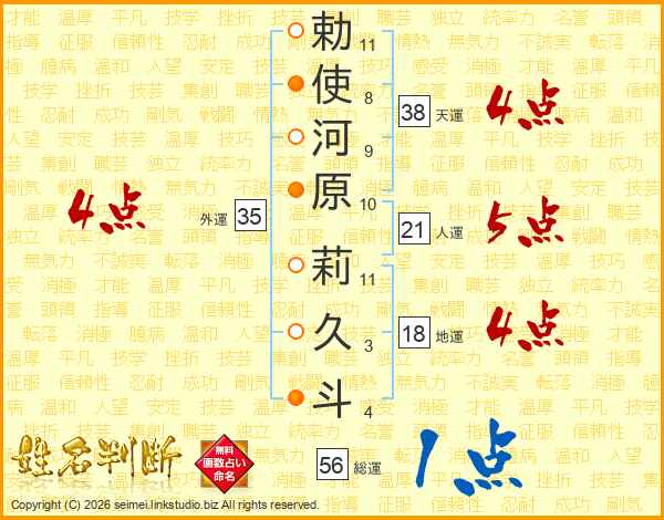 勅(11画)使(8画)河(9画)原(10画) 莉(11画)久(3画)斗(4画)