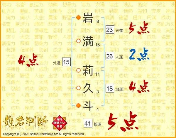 岩(8画)満(15画) 莉(11画)久(3画)斗(4画)