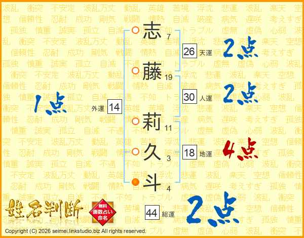 志(7画)藤(19画) 莉(11画)久(3画)斗(4画)