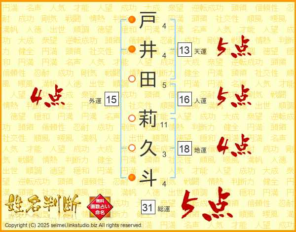 戸(4画)井(4画)田(5画) 莉(11画)久(3画)斗(4画)