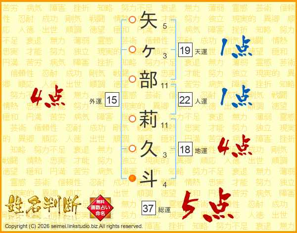 矢(5画)ヶ(3画)部(11画) 莉(11画)久(3画)斗(4画)