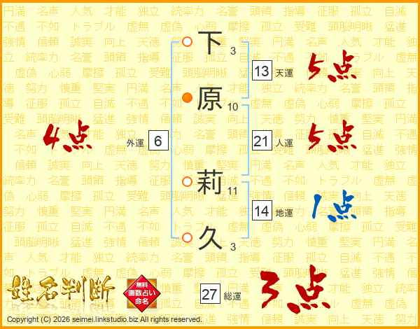 下原莉久さんの人運は21画の5点!