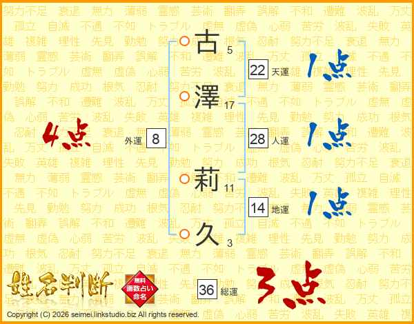 生活面を象徴する運勢です。外部から受ける影響力を表し、結婚運、家庭運や職場、環境への順応性を表します。総運から人運を引いた画数。姓や名が1文字の場合を除く。