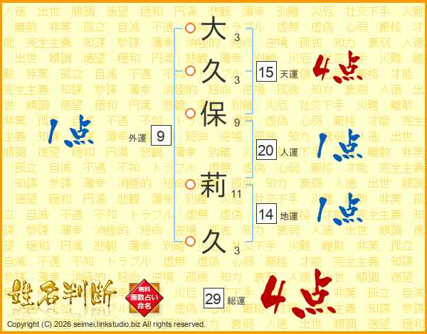 大(3画)久(3画)保(9画) 莉(11画)久(3画)