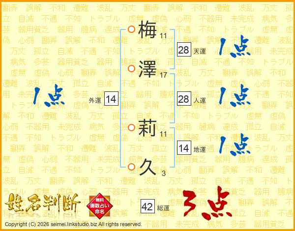 梅(11画)澤(17画) 莉(11画)久(3画)