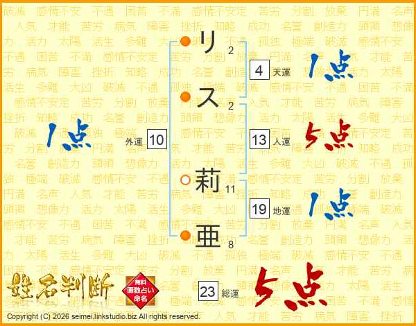 リ(2画)ス(2画) 莉(11画)亜(8画)