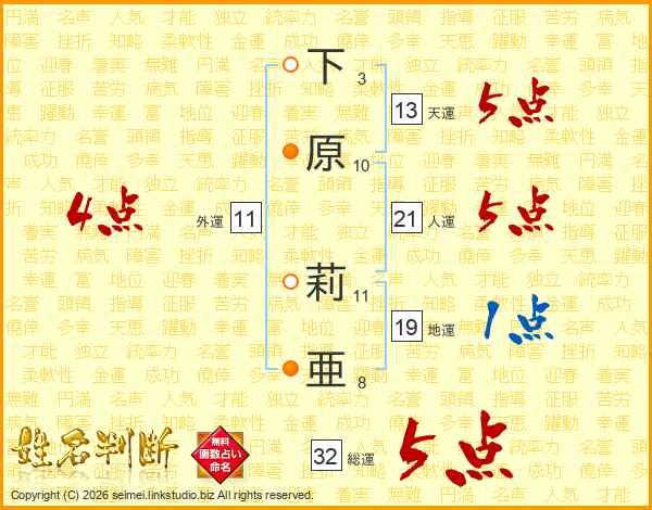 下原莉亜さんの総運は32画の5点!
