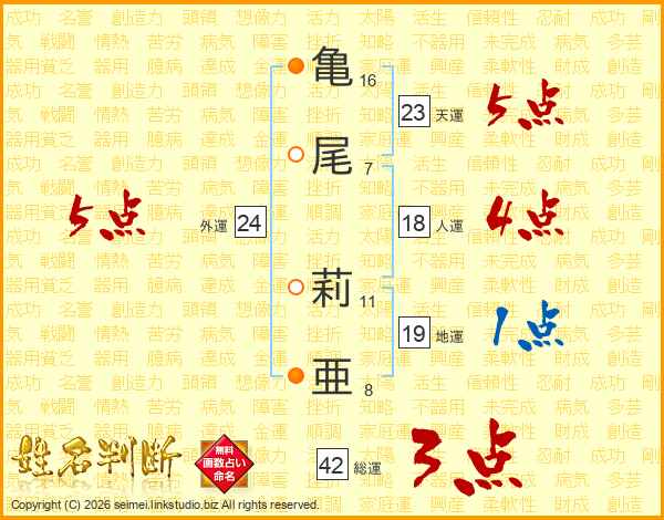亀(16画)尾(7画) 莉(11画)亜(8画)