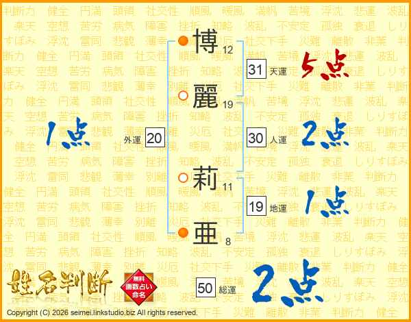 博(12画)麗(19画) 莉(11画)亜(8画)