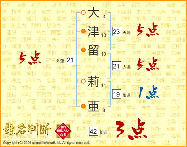 大(3画)津(10画)留(10画) 莉(11画)亜(8画)