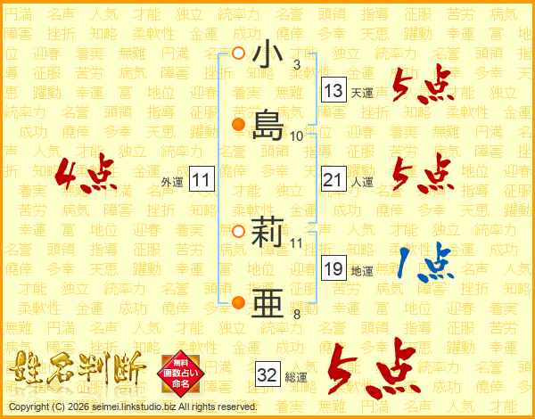 小(3画)島(10画) 莉(11画)亜(8画)