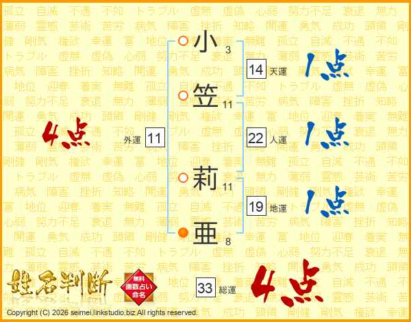 小(3画)笠(11画) 莉(11画)亜(8画)